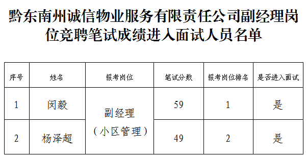 黔東南州誠(chéng)信物業(yè)服務(wù)有限責(zé)任公司副經(jīng)理崗位競(jìng)聘筆試成績(jī)及進(jìn)入面試人員名單公示