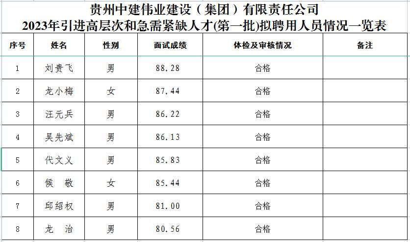 根據(jù)《貴州中建偉業(yè)建設(shè)(集團(tuán))有限責(zé)任公司高層次人才和急需緊缺人才引進(jìn)工作方案》,經(jīng)報(bào)名、資格審查、面試、體檢和考察等程序,劉貴飛等八位同志列入貴州中建偉業(yè)建設(shè)(集團(tuán))有限責(zé)任公司2023年引進(jìn)高層次和急需緊缺人才(第一批)擬聘用對(duì)象(詳見(jiàn)附件),現(xiàn)予以公示。